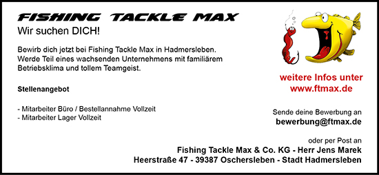 Wir, die Firma Fishing Tackle Max GmbH & Co. KG aus Oschersleben (Stadt Hadmersleben), suchen zwei neue Mitarbeiter. Jetzt bewerben!