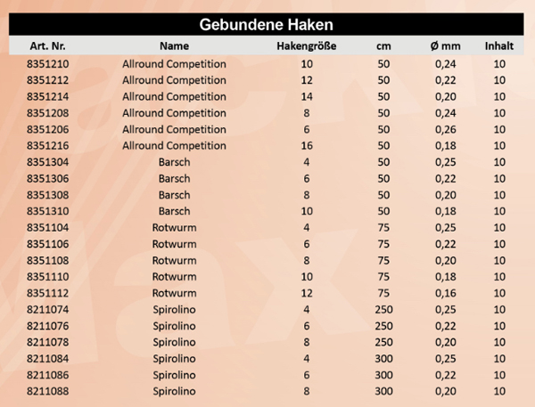 heute gibt es einen weiteren Kurzbericht aus der Rubrik „Kurz und Knapp“. Max Hohlfelder, FTM-Prokurist und Allroundexperte, stellt diesmal die neuen Ausführungen unserer fertige gebundenen Vorfachhaken vor. Fachhändler können diese ab sofort unter der Artikelnummern im unten stehenden Bild bei Fishing Tackle Max bestellen.