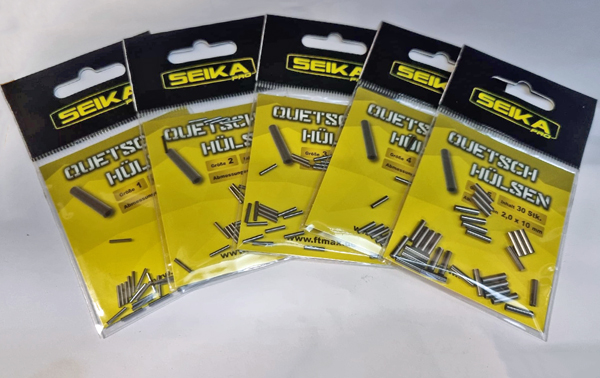 Ab sofort zählen Quetschhülsen auch zum Sortiment von Seika Pro. Sie passen ideal zu unserem Stahl und Fluorocarbon in Meterware. Erhältlich sind fünf Größen mit den Innendurchmessern 0,8, 1,0, 1,2, 1,6 und 2,0 mm. Die 2,0 mm-Version ist 10 mm lang, die anderen Varianten haben eine Länge von 8 mm. Die Seika Pro Quetschhülsen bestehen aus Edelstahl und sind unauffällig gefärbt. Da sie sehr robust sind, lassen sich damit auch grobe Montage für große Hechte anfertigen.