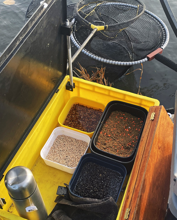 Mein Futter bestand diesmal aus dem Hause van de Eynde. Dies hat schon seit Jahren mein Vertrauen an den holländischen und belgischen Gewässern und ich kombiniere es gerne mit den Fluo-Partikeln in orange. Köder waren Maden, Pinkies, Caster und etwas Hanf zum Füttern hatte ich ebenfalls dabei.