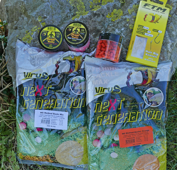 Als Köder kamen Senshi Baits Boilies und Dumbells an den Haken. Besonders fängig waren die Geschmacksichtungen Lobster, Red Berry und Chocolate. Als Futter diente eine Mischung aus Method Master Mix Orange und Method Basic Mix. Die Köder präsentierten wir am Hair Rig Bajonett.