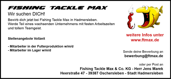Wir, die Firma Fishing Tackle Max GmbH & Co. KG, sind ein renommierter Großhandel für Lebendköder, Angelgeräte, Angelzubehör und Futtermittel mit etwa 35 Mitarbeitern in Oschersleben - Stadt Hadmersleben.