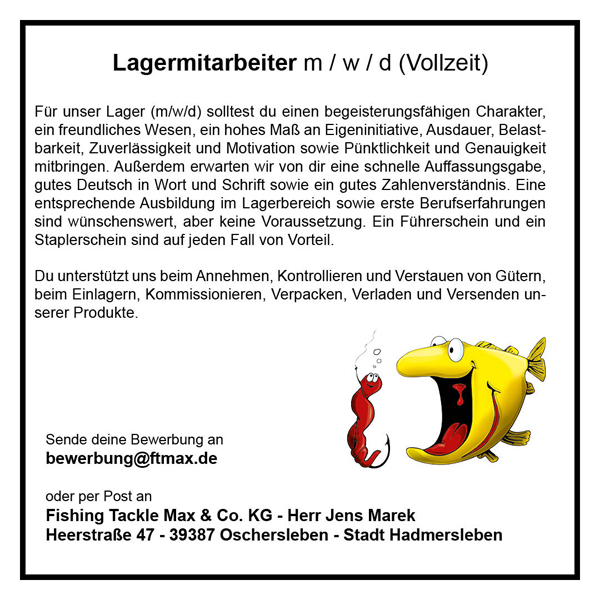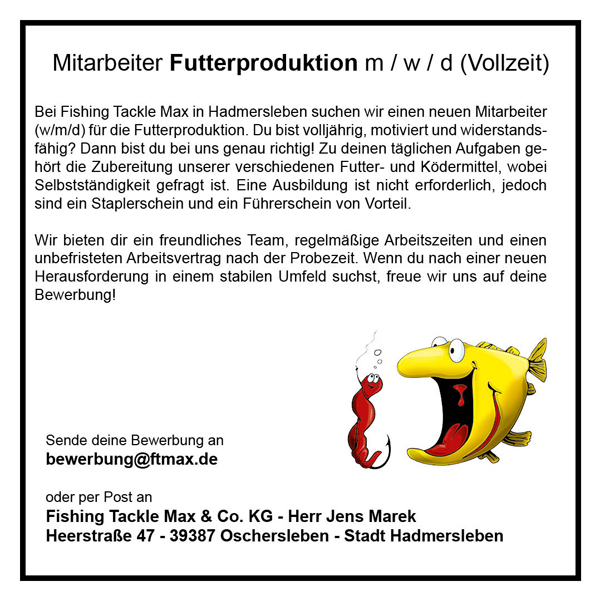 Es gibt zwei neue Jobs bei Fishing Tackle Max. Wir suchen jeweils einen neuen Mitarbeiter für unsere Futterproduktion und unser Lager.