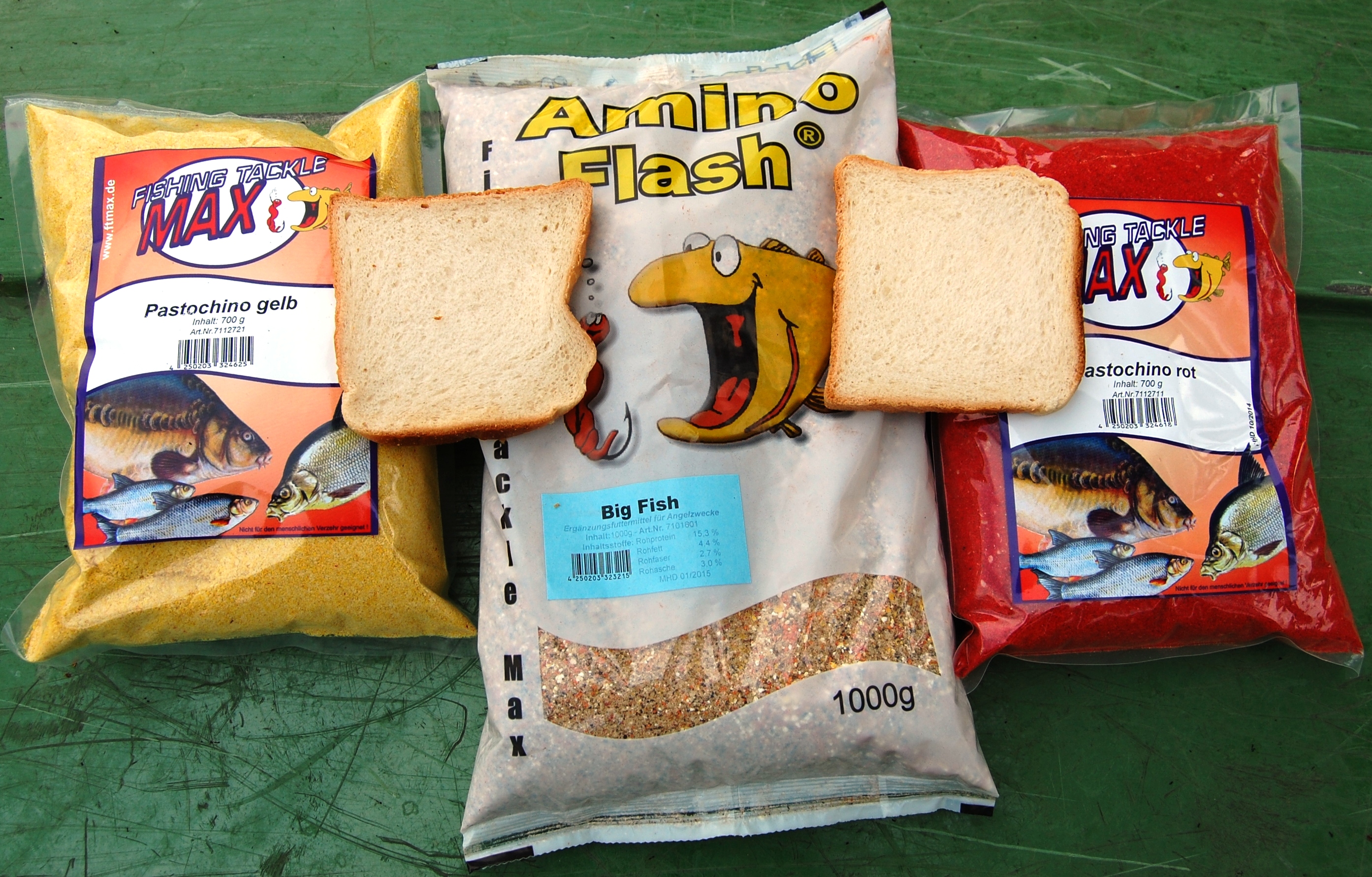 Zutaten: 1 kg Amino Flash Big Fish, je 100 Gramm Pastochino gelb und rot, Toastbrotstücke, Maden und Caster.