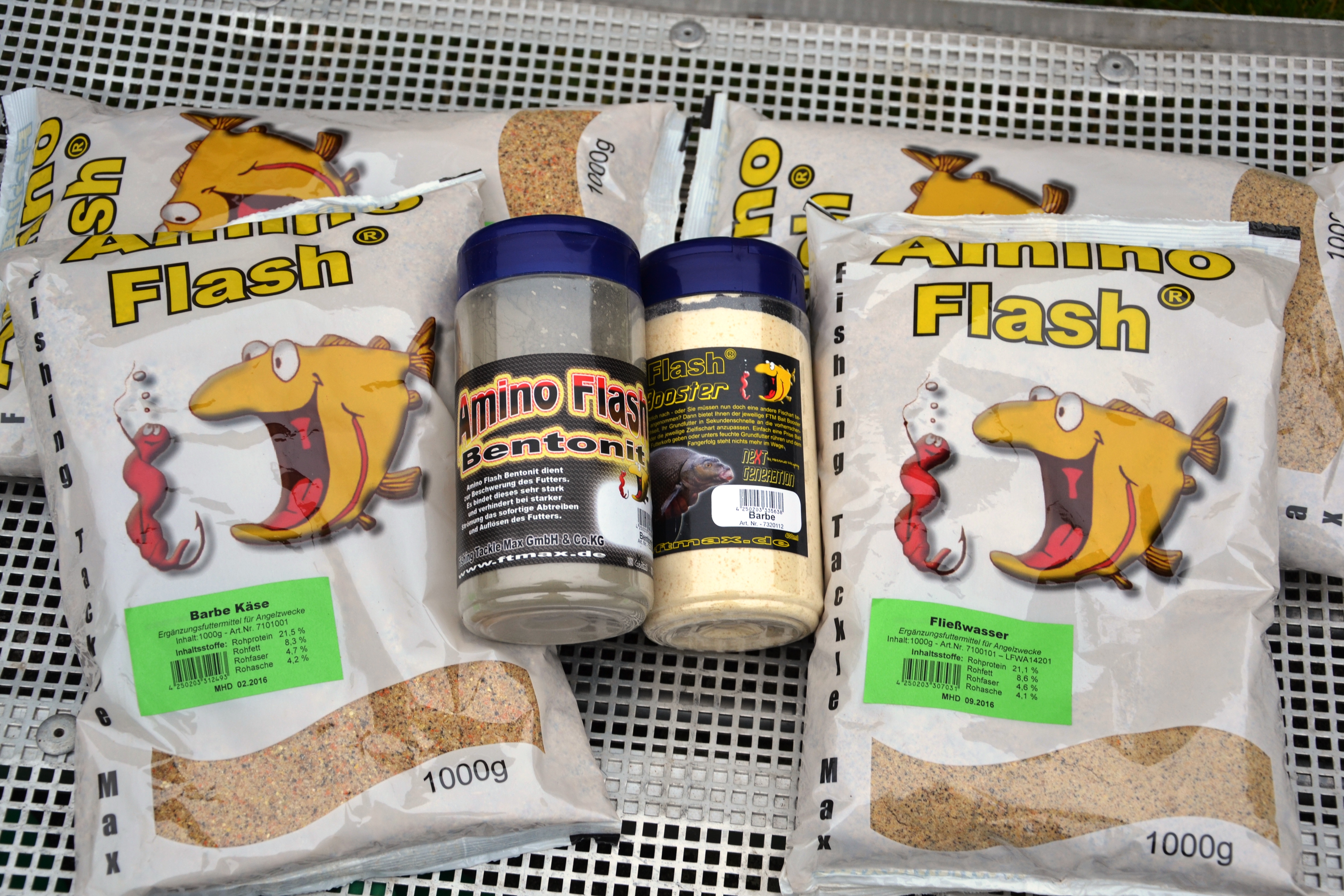 Meine Mischung sieht wie folgt aus: Ich mische im Verhältnis eins zu eins Amino Flash Fließwasser und Animo Flash Barbe - Käse von FTM. Dazu gebe ich auf zwei Kilo Mischung noch einen Esslöffel Amino Flash Booster Barbe. Je nach Strömung setze ich dann noch Betonit (Futterbinder) zu. Bei sehr starker Strömung kommt zusätzlich noch Kies unter das Futter. Des Weiteren gebe ich reichlich Lebendköder, meist Maden, mit in die Mischung.