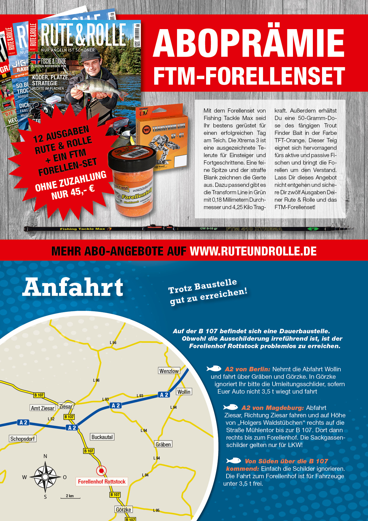 Angeln ist liegt voll im Trend. Immer mehr Jugendliche, Frauen und auch Prominente bekennen sich zu unserem Hobby. Fishing Tackle Max möchte nun noch mehr Personen für den Angelsport begeistern. Dafür findet in Zusammenarbeit mit der bekannten Zeitschrift Rute&Rolle am 9. und 10. September ein großes Forellenevent statt. Nicht nur begeisterte Angler sondern auch alle, die sich für das Angeln interessieren, sind zu dieser Veranstaltung im Forellenhof Rottstock herzlich eingeladen.