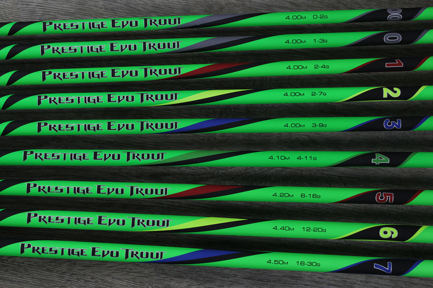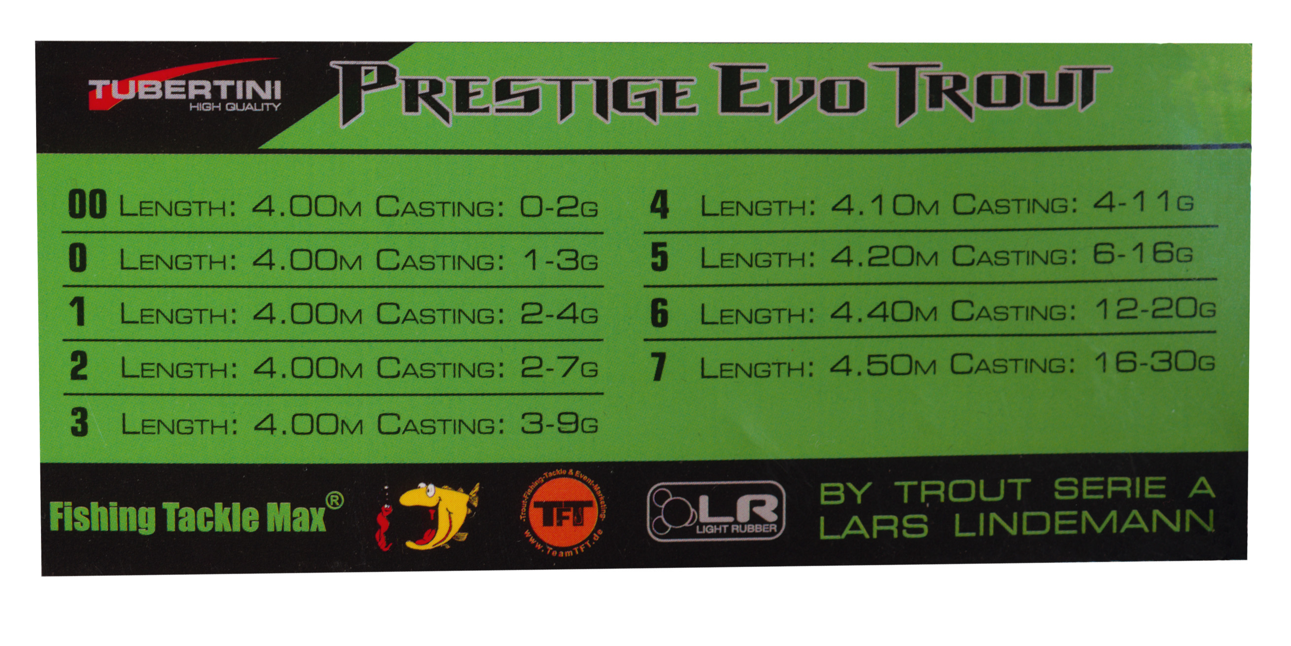 Ein ganz entscheidender Vorteil der Prestige Evo Trout-Serie ist ihre unglaubliche Vielseitigkeit. Fishing Tackle Max bietet die Rute in neun Ausführungen an, die wirklich alle Bereiche der Forellenangelei abdecken. Die Längen liegen zwischen 4 bis 4,50 Meter und die maximalen Wurfgewichten betragen zwischen 2 und 30 Gramm. Egal, ob Sie lieber mit Bombarde, Sbirolino oder Pose angeln: Im Sortiment der Prestige Evo Trout finden Sie garantiert die passende Rute.