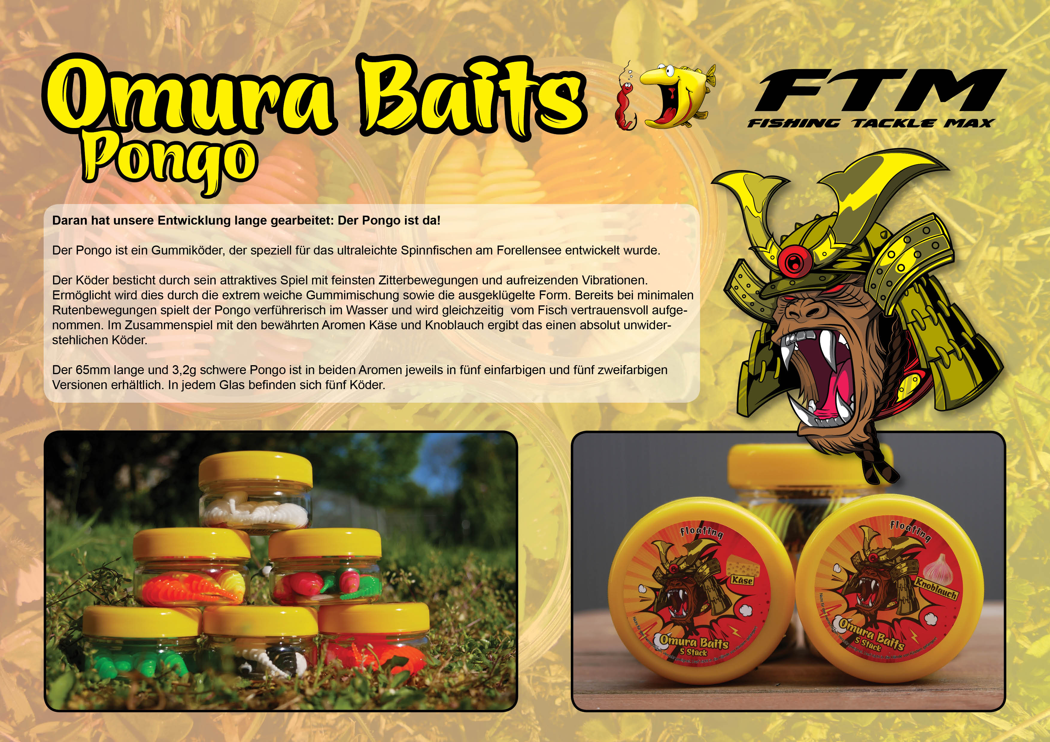 Im Zusammenspiel mit den bewährten Aromen Käse und Knoblauch ergibt das einen absolut unwiderstehlichen Köder. Der 65 mm lange Pongo ist mit Knoblauch- und mit Käsearoma erhältlich. Beide Aromen gibt es jeweils in fünf einfarbigen und fünf zweifarbigen Versionen.