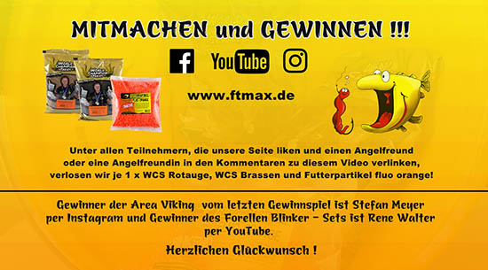 Auch diesmal habt ihr die Chance auf einen Gewinn. Unter allen Personen, die bei YouTube, Facebook oder Instagram einen Angelfreund oder eine Angelfreundin in einem Kommentar unter diesem Video erwähnen und die außerdem unseren Kanal abonniert haben, verlosen wir ein Futterset bestehend aus jeweils 1 Tüte WCS Rotauge, WCS Brassen und Futterpartikel fluo orange.