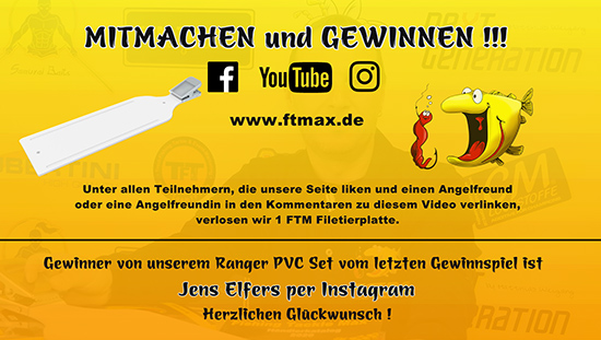 Auch diesmal habt ihr die Chance auf einen Gewinn. Unter allen Personen, die bei YouTube, Facebook oder Instagram einen Angelfreund oder eine Angelfreundin in einem Kommentar unter diesem Video erwähnen und die außerdem unseren Kanal abonniert haben, verlosen wir ein ganz neues Produkt aus unserm Katalog - nämlich die Filetierplatte.