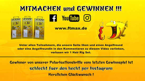 Auch diesmal habt ihr die Chance auf einen Gewinn. Unter allen Personen, die bei YouTube, Facebook oder Instagram einen Angelfreund oder eine Angelfreundin in einem Kommentar unter diesem Video erwähnen und die außerdem unseren Kanal abonniert haben, verlosen wir ein Set bestehend aus je einem Hair Rig Bajonett, einem Hair Rig Quickstop und einem Hair Rig Band.