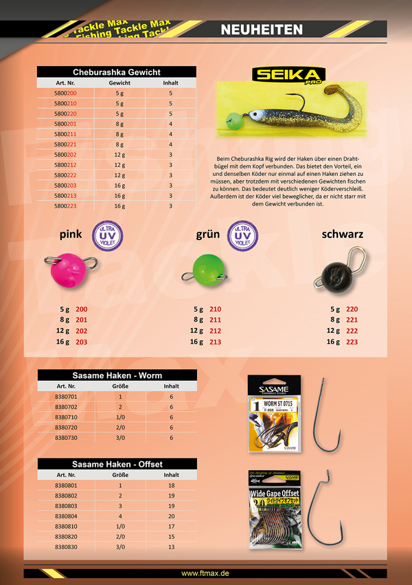Vor einigen Wochen gab es bereits im Forellenprogramm von Fishing Tackle Max eine russische Offensive, denn die für das russische Cheburashka-Rig notwenigen Teile werden von uns seither in entsprechend kleinen Größen verkauft. Jetzt zieht unser Seika Pro-Raubfischprogramm nach. Ab sofort sind nämlich Cheburashka-Gewichte und -Haken für Hecht, Zander und Co. bei uns erhältlich.