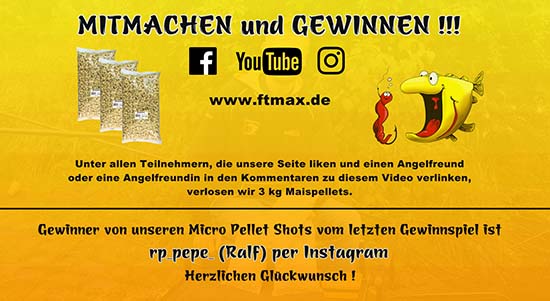 Auch diesmal habt ihr die Chance auf einen Gewinn. Unter allen Personen, die bei YouTube, Facebook oder Instagram einen Angelfreund oder eine Angelfreundin in einem Kommentar unter diesem Video erwähnen und die außerdem unseren Kanal abonniert haben, verlosen 3 kg Maispellets.