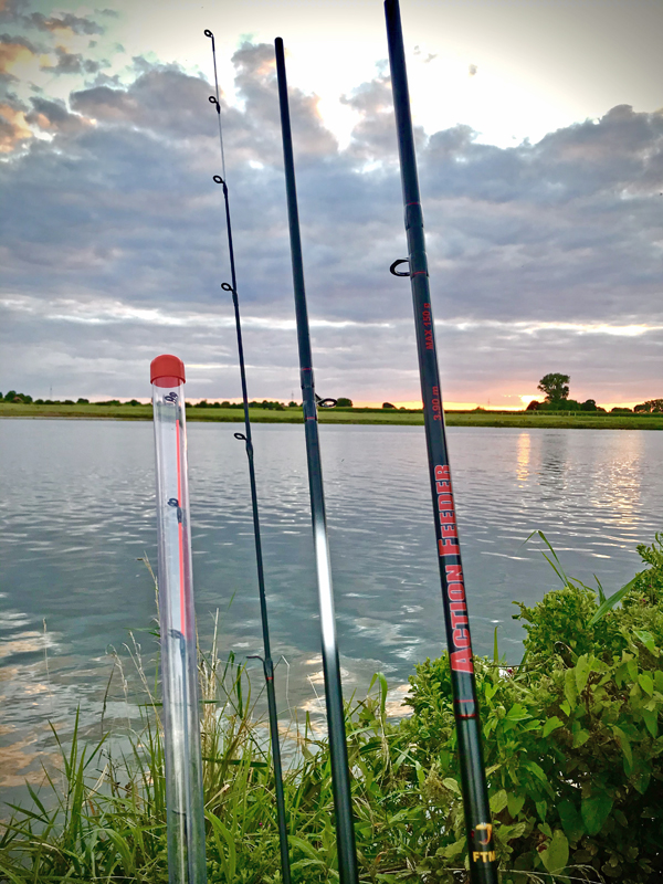 Als kräftige Feederrute habe ich seit einiger Zeit die neue Action Feeder von Fishing Tackle Max im Einsatz. Die Rute ist als 3,90 m lange Ausführung mit zwei Wurfgewichten erhältlich. Die wären eine 90 g-Version und eine 150 g-Version. Ich verwende die schwere Variante. Sie wird mit drei Wechselspitzen in den Stärken 2, 3 und 4 oz geliefert.