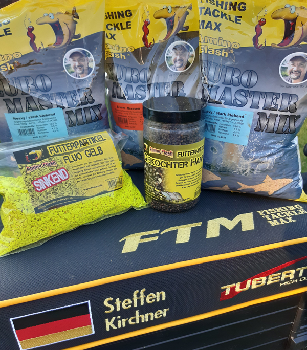 In der Elbe kommt ein Futter was eine hohe Bindung aufweist zum Einsatz. An manchen Tagen müssen viele Partikel und Köder eingebracht werden, um den Fisch an den Platz zu locken und ihn auch dort bei Laune zu halten. Hierbei greift Steffen Kirchner auf das FTM-Futter Euro Master Mix Heavy in Verbindung mit dem Brassenfutter Euro Master Mix Bream zurück. Es ist sinnvoll, Hanfkörner und eine Prise bunter Partikel als zusätzliche Eyecatcher in das Futter zu mixen.