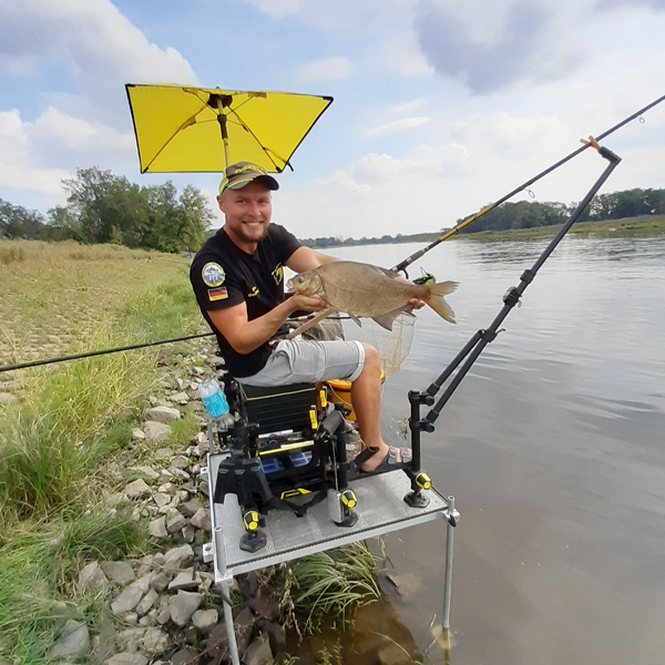 Steffen Kirchner verwendet zum Feedern eine Plattform, die er zwischen den Steinen sehr hoch aufstellt. Dies hat den Vorteil, dass er die Kiepe standfest positionieren kann . Ein weiterer wichtiger Vorteil: Die Rute steht höher und somit wird der Druck der Strömung auf der Schnur minimiert.