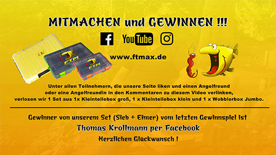 Auch diesmal habt ihr die Chance auf einen Gewinn. Unter allen Personen, die bei YouTube, Facebook oder Instagram einen Angelfreund oder eine Angelfreundin in einem Kommentar unter diesem Video erwähnen und die außerdem unseren Kanal abonniert haben, verlosen wir 1 Set aus diesen 3 verschiedenen Köderboxen.