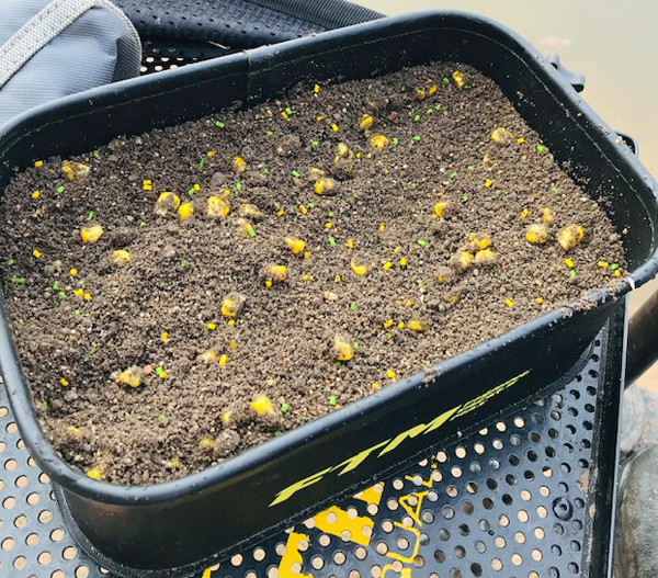 Am Gewässer angekommen, wurde schnell das Tackle aufgebaut und das Futter angefeuchtet. Dieses bestand aus dem Black Hammer aus der Range von CM Lockstoffe by FTM, vermischt mit einigen FTM Samurai Baits Micro Pellets und Maiskörnern.