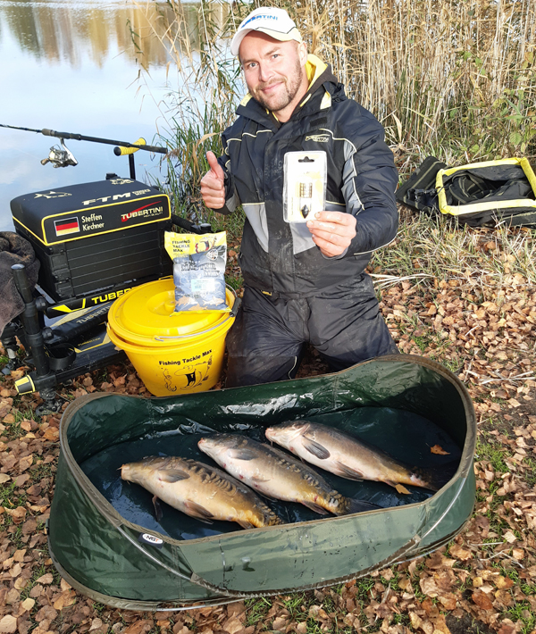 Besonders begeistert war Steffen Kirchner von der verwendeten Feederrute. Es handeöte sich um die FTM Hornet in der kürzesten Länge von 2,70 m. Sie pufferte sauber die Schläge der Karpfen ab und brachte ein direktes Feeling zum Fisch. Auch das Futter mit seiner markanten, würzigen Note konnte überzeugen. Auch wenn die eigentlichen Zielfische sich nicht sehen ließen, blieb der Spaß blieb nicht aus. So waren es Karpfen, die zwar dem Gerät und Material alles abverlangten, aber dennoch sicher gelandet werden konnten. Die hohe Qualität der Produkte aus dem Hause Fishing Tackle Max zahlt sich gerade in solchen Situationen aus.