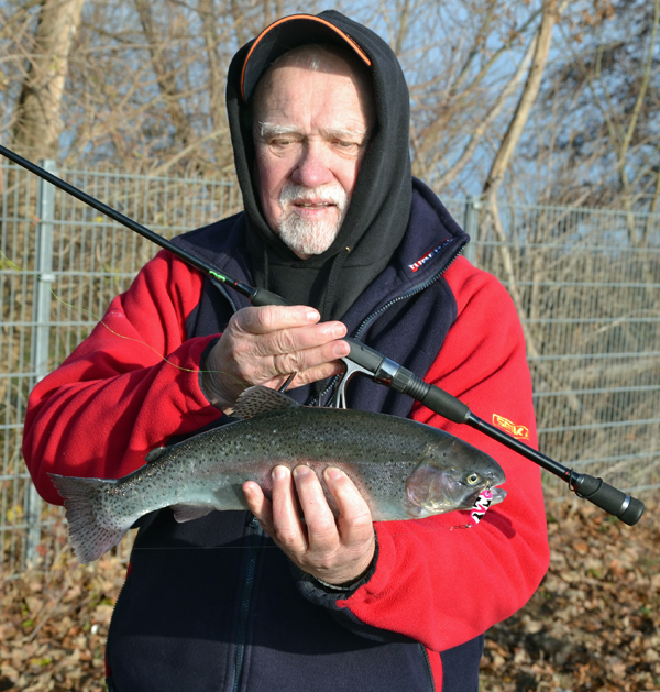 Selbstverständlich gibt es hier aber nicht nur kleine Fische. Der Angler kann sich zum Beispiel mit richtig großen Lachsforellen anlegen. Hinzu kommen Regenbogner in guter Portionsgröße, Goldforellen, Saiblinge und Bachforellen. Die Fische stammen alle aus der eigenen Produktion der "Kleinen Fischzucht“. Sie ist ein von der EU anerkannter Betrieb der Kategorie 1. Da das Wasser, welches die Teiche speist, um die zehn Grad warm ist, bleiben sie auch im Winter meist eisfrei.