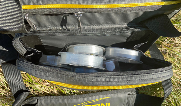 Zusätzlich zu dem geräumigen Hauptfach besitzt die Tasche Genius noch ein weiteres kleines Fach mit Reißverschluss an der Vorderseite. In diesem transportiere ich meistens Schnüre und andere Kleinteile. Zum Tragen sind ein breiter, bequemer Schultergurt sowie zwei kleinere Hand-Tragegurte vorhanden.