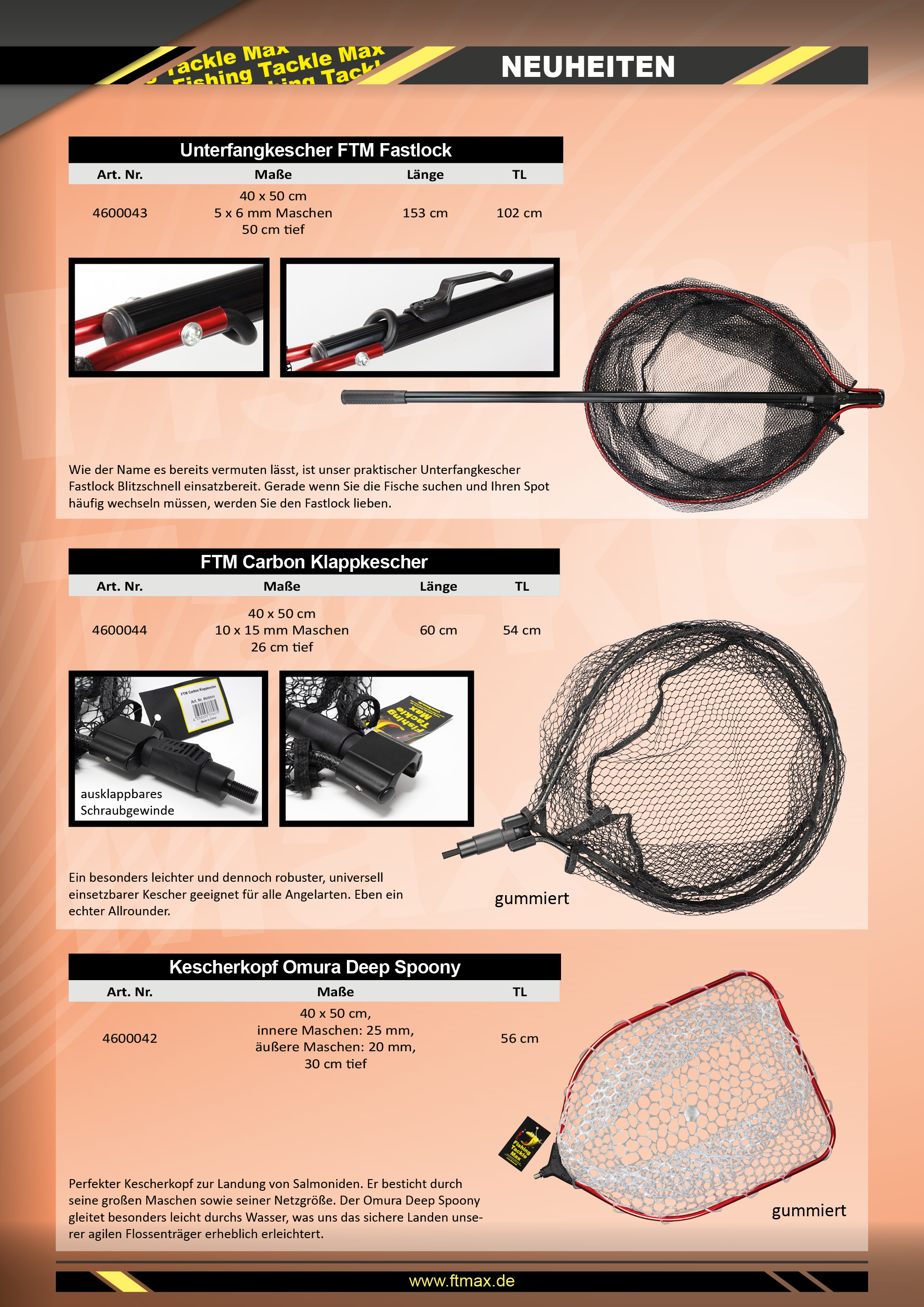 Der Kescherstab FTM Alu ist auf bis zu 2 Meter teleskopierbar. Passend dazu gibt es den neuen Kescherkopf Omura Deep Spoony. Er gleitet besonders leicht durchs Wasser und besticht durch seine großen Maschen. Der Carbon Klappkescher hat ein praktisches ausklappbares Schraubgewinde. Er ist besonders leicht und trotzdem robust. Der Unterfangkescher FTM Fastlock ist besonders schnell einsatzbereit. Er lässt sich auf bis zu 153 cm teleskopieren.