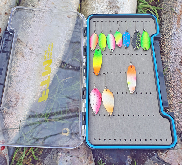 Jeder dieser Spoons hat eine Sonderfarbe, die extra für den Kalender produziert wurde. Wir fischten ausschließlich mit diesen Spoons und erlebten einen fantastischen Angeltag. Die Forellen fuhren voll darauf und ab, so dass ständig irgendeine Rute krumm war.