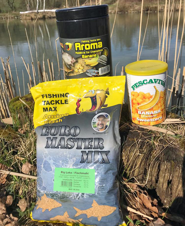 Ich kombiniere sehr gerne das FTM-Bananenaroma (Artikelnummer 7320253) mit dem Euro Master Mix Big Lake Fischmehl (Artikelnummer 7320253). Ein bis zwei Esslöffel des Aromakonzentrats auf ein Kilo Futter reichen völlig aus. Als Köder verwende ich häufig den Pescaviva Angelmais - natürlich auch mit Bananenaroma (Artikelnummer 7310020).